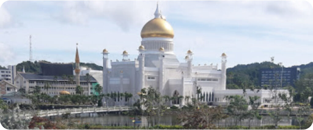 黄金のドームが輝くブルネイを代表するモスク、人工湖の上に浮かぶように建てられており、夜のライトアップが美しく、観光客も見学可能(服装に注意)