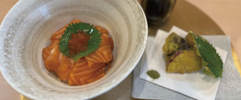 店内はヒノキの一枚板カウンターが際立つ上質な和の空間。わずか7席のこぢんまりとした店ながら、信楽焼の器や席ごとの照明など細部まで美意識が行き届き、静かで贅沢なひとときを演出します。