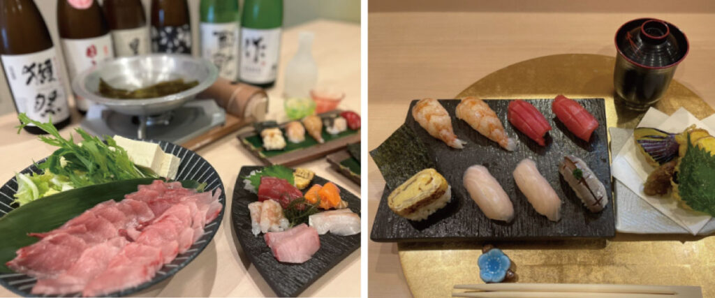 「おまかせコース」(38,500円):四季折々の最高の食材を活かした渾身の握りを提供。料理に合う日本酒とともに極上のひと時を堪能できます。