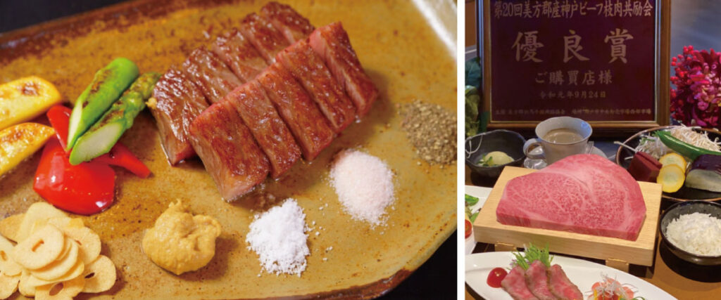 「神戸牛ステーキ」(6,600円〜22,275円):ロース・ヒレ・モモの3部位から選べ、グレードや量によって約15種類のメニューを展開。自分好みの一皿に出会える楽しみがあります。