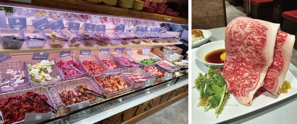 食べ放題メニューには、カルビやロース、ホルモンなど人気の和牛部位に加え、サラダ、スープ、ご飯、カレー、ラーメン、デザートまで、約100種類のメニューが含まれます。
