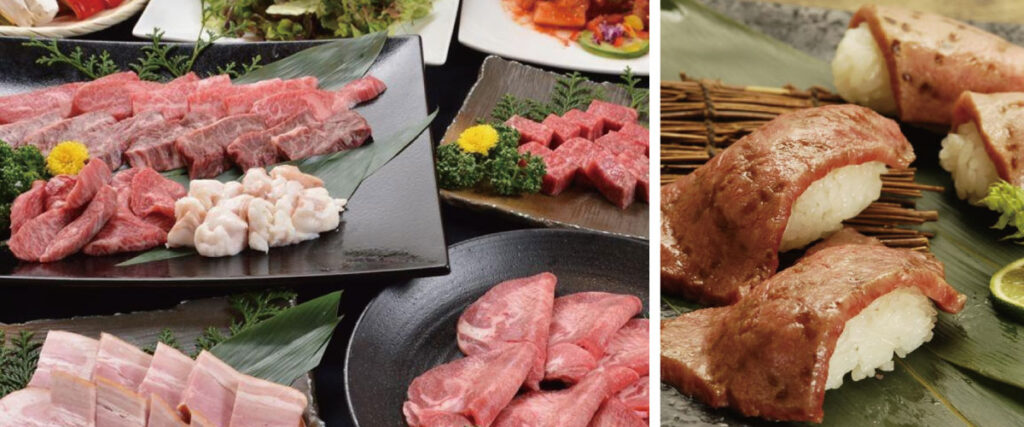 全国の名だたる産地から黒毛和牛を一頭買いし、定番部位はもちろん、希少部位のステーキ、牛炙り寿司、名物「とろける和牛焼きすき」など、多彩なメニューを提供しています。
