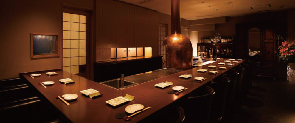 JR「北新地駅」から徒歩約2分。繁華街の路地にひっそりと佇む鉄板焼きの名店です。最高級A5和牛や国産の魚介を、シェフの妙技で贅沢に焼き上げます。特に「活アワビの鉄板焼き 肝ソース」は看板メニューとして大好評。