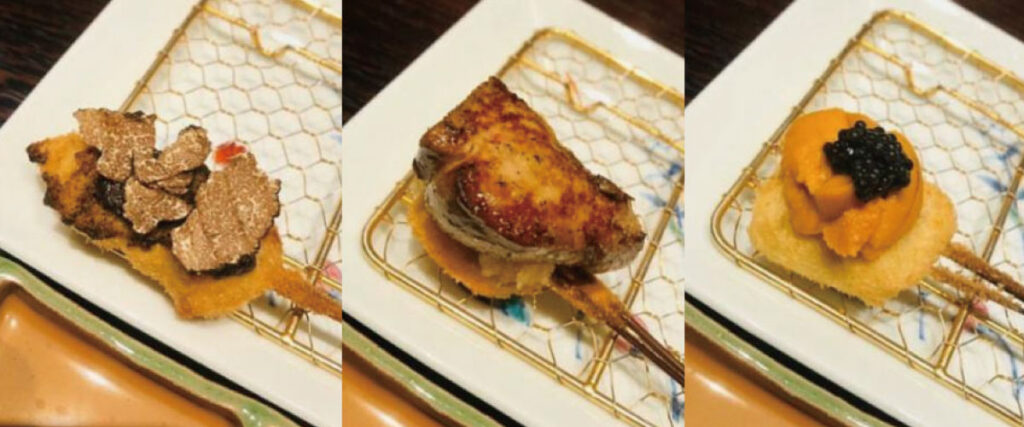 ミシュラン掲載の上質な串揚げ店。フォアグラやシャトーブリアン、雲丹、キャビア、トリュフなど、最高級の素材を惜しみなく使用した贅沢な串かつが楽しめます。