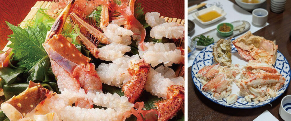 「かにづくしコース」 (2名〜/16,000円):活かに刺し身、かにシューマイ、焼きたらば、季節の茹で蟹盛り合わせなど全11品の人気のコース。