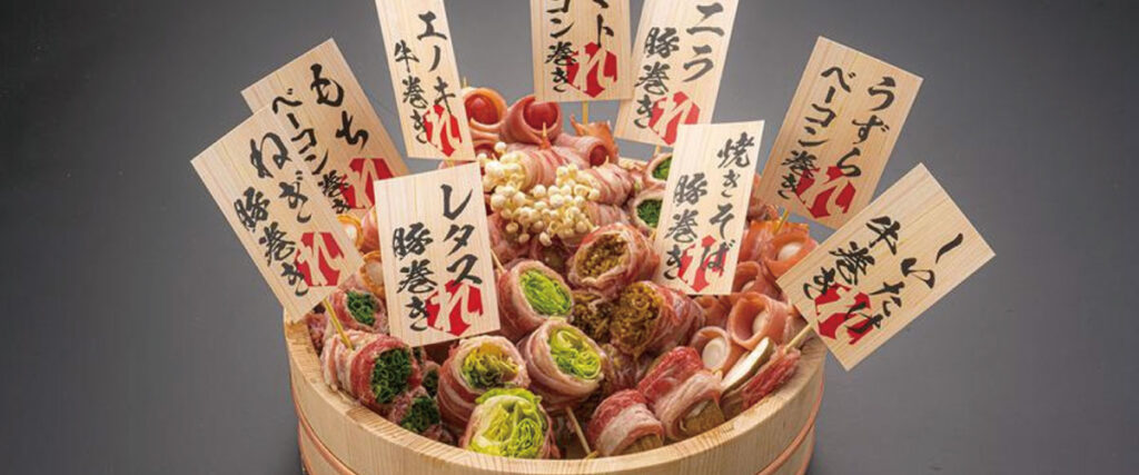 「野菜巻き串焼」(320〜490円):レタス豚巻きやエノキ牛巻き、ウズラベーコン巻きなど、野菜本来の甘みと肉の旨味が絶妙に絡み合う逸品。