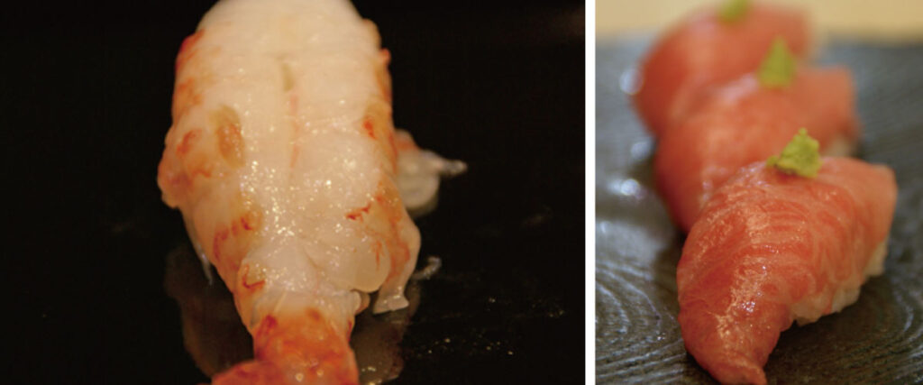 ネタとの相性を考慮し、2種類の酢を絶妙に配合した特製シャリは、程よい甘さと酸味のバランスが特徴。少し硬めに炊き上げたご飯は口の中で「ほどけていく」食感に仕上げられています。長年取引のある中央卸売市場から、その日使う分だけを仕入れる徹底したこだわりにより、いつでも最高の鮮度を楽しめます。