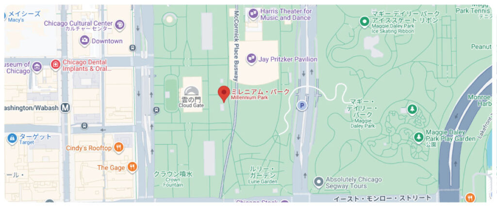 ミレニアム・パークはシカゴ中心部「ループ(The Loop)」エリアに位置しており、観光の拠点からのアクセスが非常に便利です。