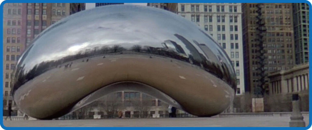 公園を代表する巨大アート作品で、鏡のように磨き上げられたステンレスの曲面にシカゴの摩天楼や訪れる人々の姿が映り込みます。