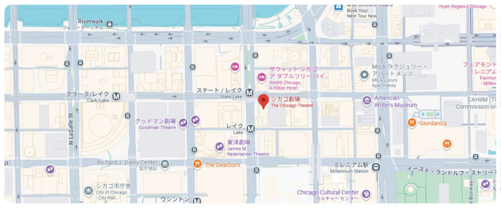 劇場はシカゴのダウンタウン「ループ地区」に位置しており、徒歩圏内にショッピングエリアやレストランが多数。観光や食事とセットで訪れるのに最適なロケーションです。