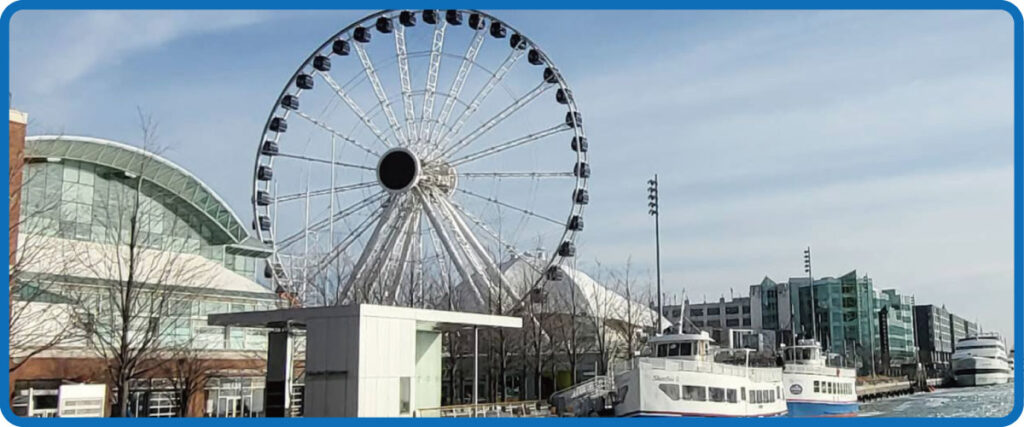ネイビーピアのシンボルともいえる大観覧車。高さ約60メートルからは、レイク・ミシガンやシカゴの摩天楼を一望できます。