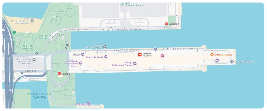 ネイビーピアはダウンタウンのミシガンアベニューから徒歩約15分。