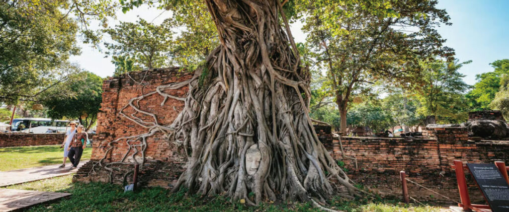 有名な「ワット・マハタートの木の根に絡まる仏頭」や「ワット・ヤイ・チャイ・モンコンの巨大な涅槃仏」など、インスタ映え間違いなしの絶景が満載。