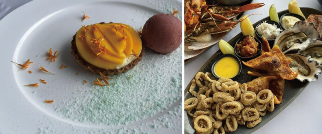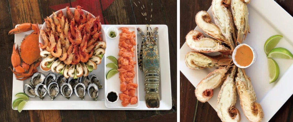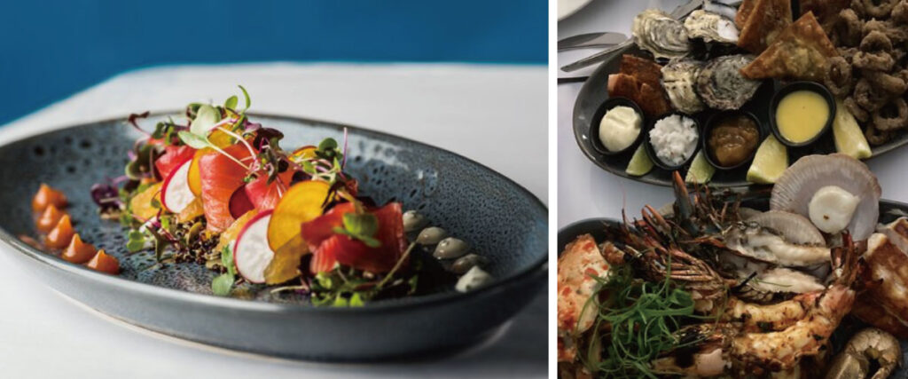 ・シーフード・プラッター:余計な装飾なしで新鮮なシーフードだけを味わえる贅沢な一皿。生ガキ、車エビ、ウチワガニ、バラマンディなど、オーストラリアの新鮮なシーフードを堪能できます。