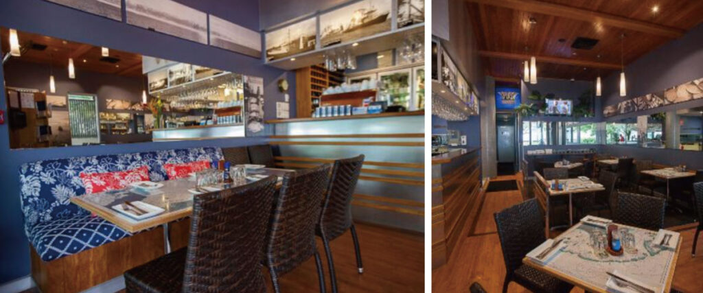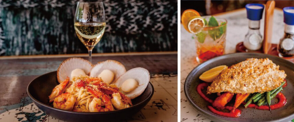 店内はモダンな海洋をテーマにしたカジュアルな雰囲気で、オーナー一族の歴史を示す海図や写真も展示されています。レストランの激戦区であるエスプラネード沿いの一番端に位置し、賑やかな中心地からほど近い場所にありながら、落ち着いた雰囲気で食事を楽しめます。