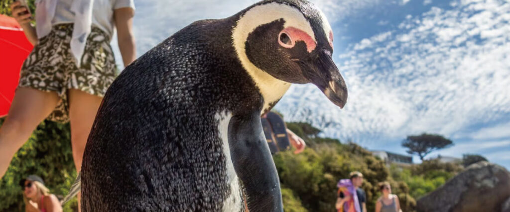 ケープペンギンが人のすぐ近くを歩き、岩場の隙間からひょっこり顔を出す姿も。