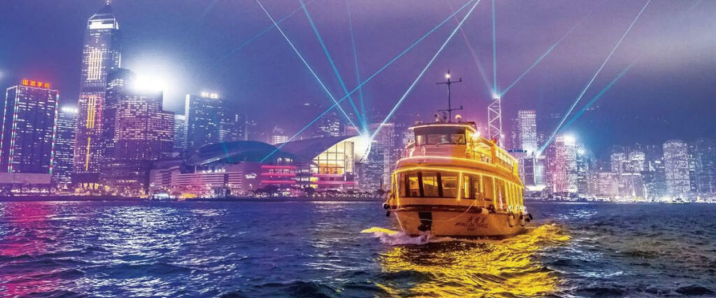 スター・フェリーに乗れば、ゆらめく海面に反射する光と、ダイナミックなレーザー演出を間近で楽しめます。