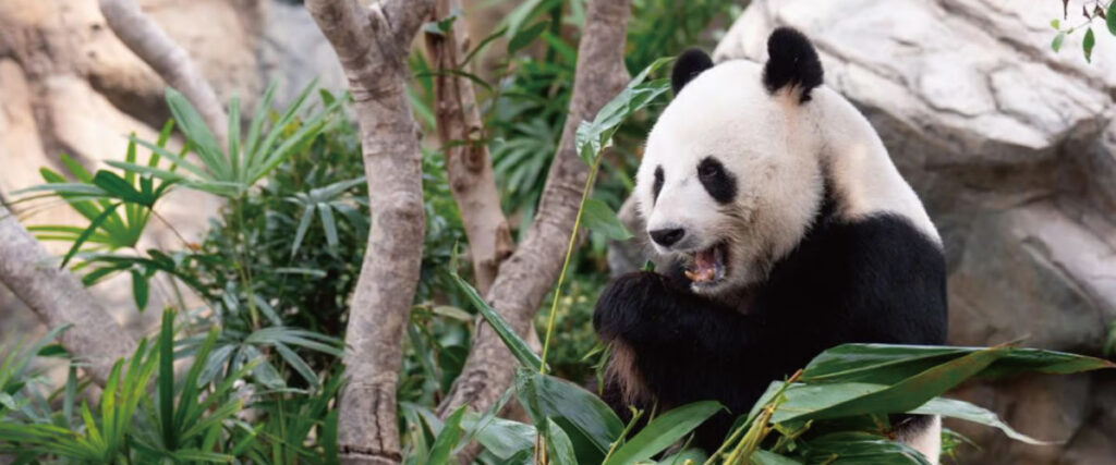 ここでは、中国・四川省から贈られたジャイアントパンダたちが、広い屋内外の飼育エリアでのびのびと暮らしています。