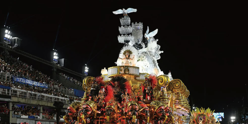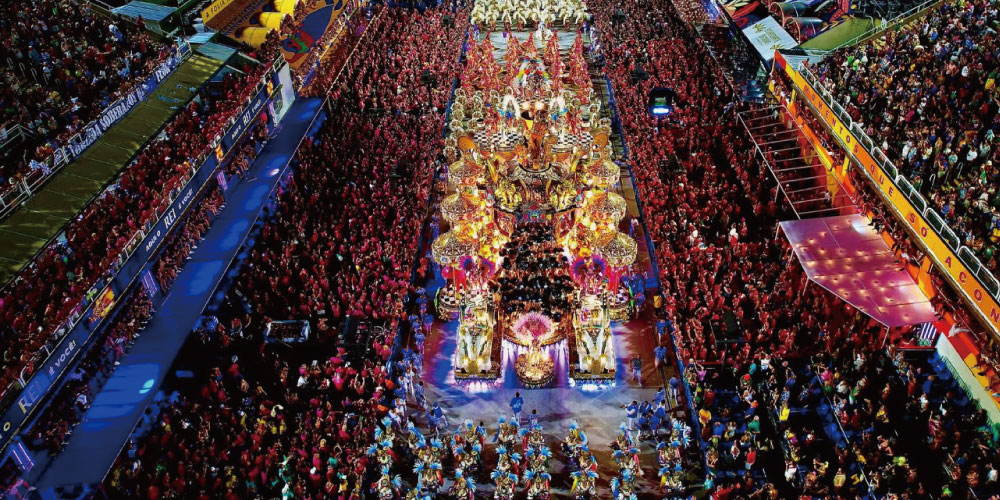 世界中に名を馳せるサンバスクールが競い合うメインイベント。豪華な衣装と巨大フロートが魅力。