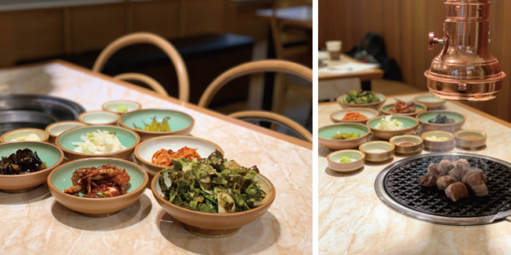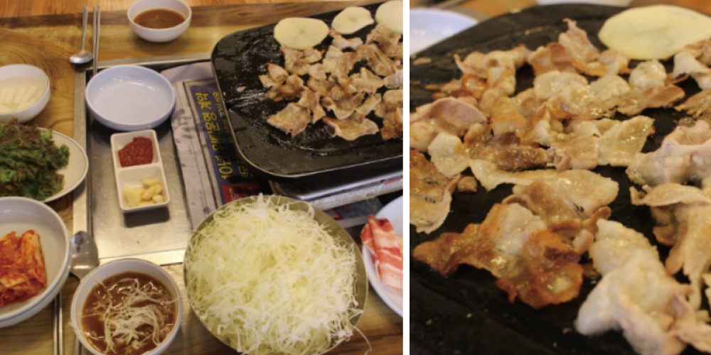 サムギョプサルは3枚肉ですが、オギョプサルは5枚肉。皮の分だけ脂の層が多く、コラーゲンもたっぷりです。また、お肉と相性が良い付け合わせのミョンヒナムル(もやしのナムル)と白キムチも評判。蒸留酒の一種「ソジュ」の美味しい店としても知られています。